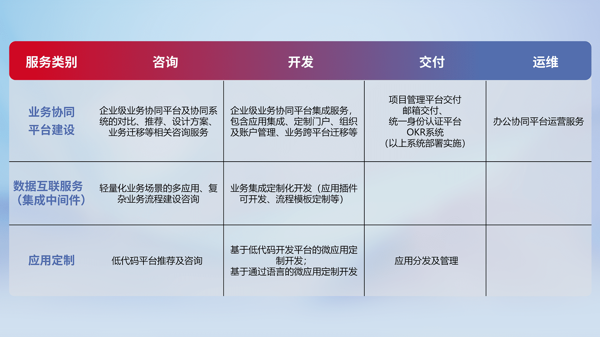 针对钉钉、、企微、、IDaas等平台级产品提供产品的规划、、、方案、、交付、、定制化开发等服务,,实现如统一协同办公、、、、智能客户服务、、、、混合会议管理、、、智能数据查询、、、、等业务场景,,,,实现数字化转型。。。