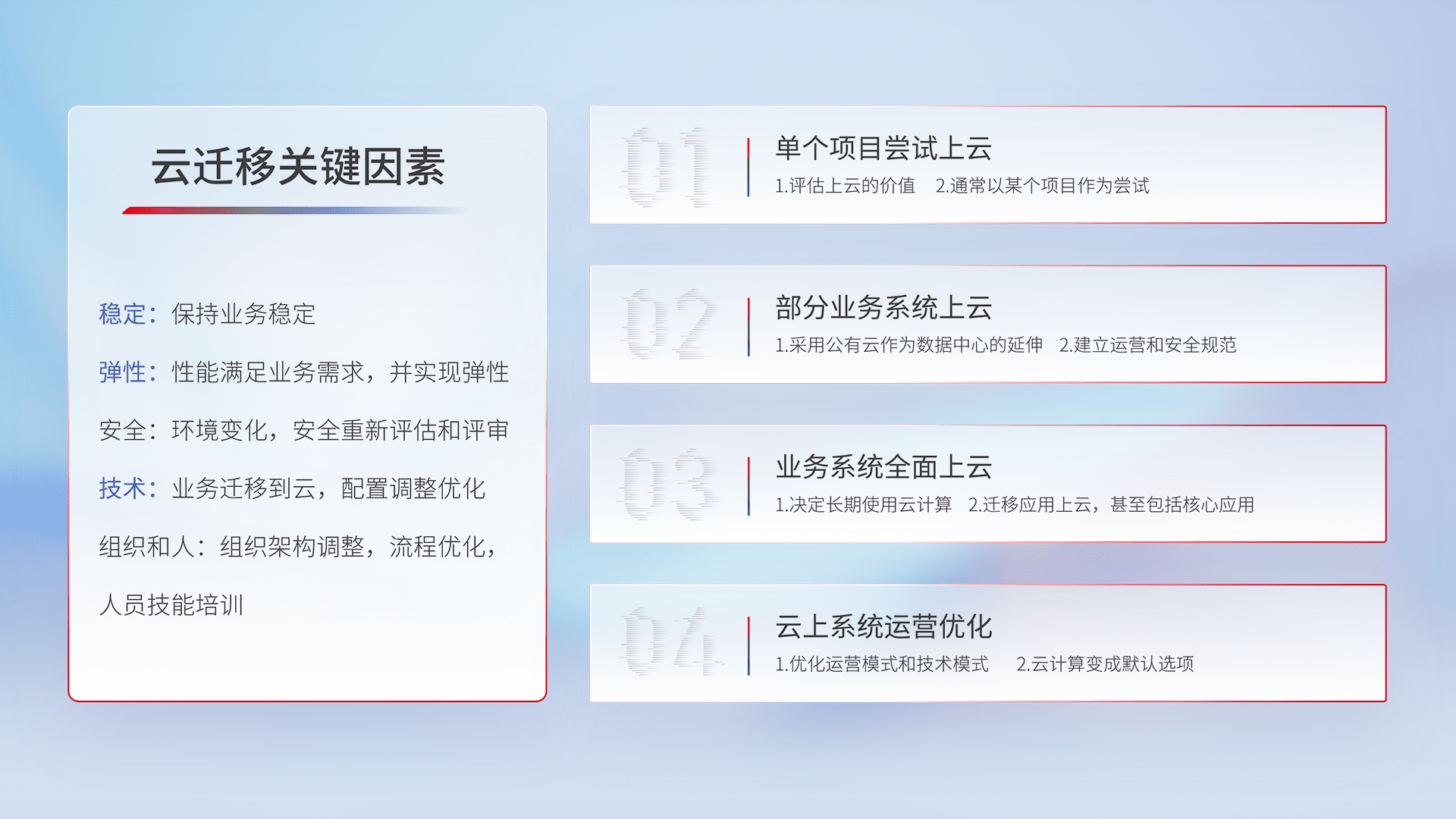 结合实际业务,,,,从规划设计、、云平台选型、、、、云原生改造、、数据迁移、、、集成交付,,,迁移全过程为客户识别最佳上云路径,,,做好风险识别管理,,,,设计网络架构、、、、身份权限、、、安全审计合规、、、、操作审计、、、、日志审计、、、、监控告警策略、、、多站点容灾设计等,,,,对云上基础设施进行整体规划,,提升IT治理水平,,,,以满足弹性、、、、高可用、、、高性能的需求。。