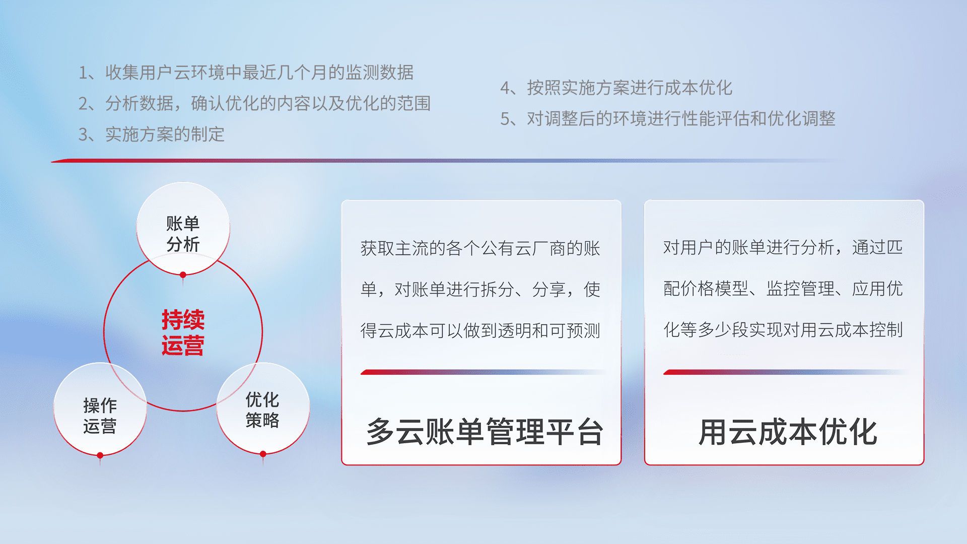 通过多云纳管,,以统一的资源数据模型把客户的云资源进行抽象和封装,,,进而实现对多云资源的统一操作,,,保障云资源管理的可靠性、、、、稳定性与可用性。。量身定制化运维内容,,,,配置、、开发运维、、补丁管理、、、、备份、、监控、、认证和访问管理、、、、审计和日常巡检等,,保障在用云过程中的可靠度,,稳定度以及高可用率。。。